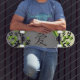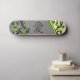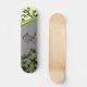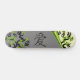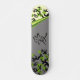 Inséparables Verts Sur Sakura Tree Et Chinese Love Symbol Skateboards. Un skateboard à l'allure asiatique avec deux inséparables vert citron sur un sakura fleuri avec des fleurs vertes sous une page grise et courbée d'un côté, un autre sakura de l'autre et le symbole d'amour chinois au milieu.