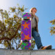 Skateboard avec un arrière - plan tourbillonnant violet et vert parsemé d'étoiles magiques, orange et vertes. Un design personnalisable violet, vert et orange pour vous permettre d'ajouter vos propres textes, images et idées. Créé à l'aide de techniques numériques par Jess Perry.