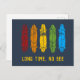 Schicken Sie Ihrem Lieblings-Langboard-Fahrer ein paar bunte Grüße. Einfache Retro-Illustrationen von Langboard-Skateboards sind in Regenbogenreihenfolge mit einem gestressten Stil für ein Retro- oder Vintages Aussehen angeordnet. Ihre eigene Nachricht oder der "lange, keine Sicht" Gruß wird in sonnigen gelben Schriftzeichen geschrieben, die sich gut vor dem Hintergrund der blauen Marine abheben.