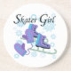Unsere Skater-Mädchenentwurf T - Shirts, Tassen, Taschen, Karten, Kissen, Wanduhren, Andenken, Hoodies und andere Skatenthemaeinzelteile kennzeichnet ein Paar Blau- und Lavendel-Skate und Handschuhe auf einer Schnur, die durch Lose winterliche Schneeflocken und Text, der, umgeben wird Skater-Mädchen liest!