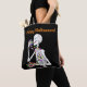 Ein Halloween-Tasche mit meinem 3D Skelett-Charakter, der auf Halloween-Bonbons pingelt. An der Front anpassbarer Text sagt: "Happy Halloween!"