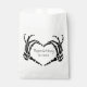 Add a creepy, personalized touch to your wedding with these paper favor bags. These bags feature an illustration of skeleton hands in a heart shape framing the bride and groom's names and wedding date. The graphic and text are in a black. The macabre style is perfect for October weddings or events with a goth theme.