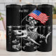 Eine bemerkenswerte Abbildung zeigt ein grinsendes Skelett, das einen Skeletthai durch das schimmernde Wasser fährt und eine große amerikanische Flagge trägt. Kleinere Fischskelette und -blasen treiben um sie herum, alle vor einem dunklen, sternenbedeckten Hintergrund. Dieses einzigartige und edgy Design verbindet das Meeresleben mit patriotischer Symbolik in einem kühlen, künstlerischen Stil.