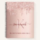 Ein Imitat Rose gold metallische Hintergrund mit eleganten Rose Gold und rosa Imitat Glitzer Tropfen, Farbe Tropfen Aussehen. Personalisieren und fügen Sie einen Namen, einen Monogrammbuchstaben und einen Titel hinzu. Der Name ist bordeauxrot geschrieben mit einem großen, modernen, handgeschriebenen Stil-Skript mit Swashes. Ideal für die Schule, als Skizze oder für Notizen. Um die Swashes behalten, löschen Sie nur den Beispielnamen, verlass die Leerzeichen oder Emoji's vor und nach dem Namen.