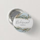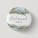 Ein schöner Knopf für Ihre Brautjungfer, die "Brautjungfer" in einem Skript-Schriftart und in ihrem Namen unter ganz gerahmtem durch einen handgemalten Watercolor botanisch und Set gegen einen verwitterten hölzernen blauen Hintergrund kennzeichnet. Ändern Sie leicht "Brautjungfer" zur Trauzeugin, zur Mutter der Braut, zum Bräutigam, zu etc., die mit einem rustikalen Chicgefühl einfach und elegant sind - vervollkommnen Sie für so viele von heutigen Hochzeitsarten.