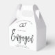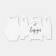 Ein lustiges und einzigartiges, auf Ihre zukünftige Engagierungsparty zugeschnittenes, mit Schrift geschriebenes Papierhandy. Es enthält das Wort "verlobt" mit den über ihm ruhenden Hochzeitsringen. Unter diesem und darüber sind die Namen der Braut und des Bräutigams und das Datum der Verlobung. An der Unterseite der Vorderseite der Box ist ein Platz für Ihre einzigartige Botschaft an Ihre Gäste.