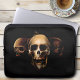 Drei menschliche Schädel vor einem Hintergrund von schwarz. Eine kleine Kreatur guckt über den mittleren Schädel