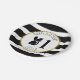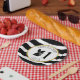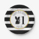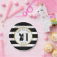 Geburtstagspapier-Teller mit einer Abbildung eines Babyskunk mit einer Blume-Krone. Hintergrund ist schwarz-weiße Streifen mit Pom-Design. Personalisieren Sie Name und Nummer