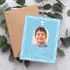Ein himmelblauer Hintergrund, mit weißem Rahmen dekoriert, und ein weißes Kreuz Persönlich und fügen einen Namen und Details des Fotos hinzu. Weißer Text. Bogenförmiger Rahmen aus Foto 1 Blatt = 1 Einladung mit Druckkante bis Kante.