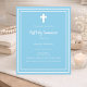Ein himmelblauer Hintergrund, mit weißem Rahmen dekoriert, und ein weißes Kreuz Persönlich und fügen Sie den Namen und die Details. Weißer Text. 1 Blatt = 1 Einladung mit Druckkante bis Kante.