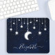 Aquarellblau Nachthimmel mit Sternen und dem Mondmaus. Ihr Name in modischer Schrift. Bokeh-Saitenleuchten.
