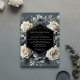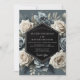This opulent design evokes a moody, romantic atmosphere with deep slate blue and cream roses. Lush, dark foliage surrounds the blooms, creating a dramatic and elegant visual. The intricate floral arrangement suggests a sophisticated, artistic theme.