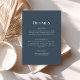 Vervollständigen Sie Ihre Hochzeitssuite mit unserer Slate Blue Monogram Wedding Details Enclosure Card. Diese Karte präsentiert elegante zusätzliche Hochzeitsdetails vor einem ruhigen, blau geschlagenen Hintergrund mit einem delikaten Monogramm. Eine perfekte Ergänzung, um die Gäste über bestimmte Einzelheiten der Hochzeit zu informieren.