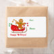 Dieses Weihnachtsgeschenk-Etikett zeigt ein niedliches Bild eines verzierten Lebkuchenmannes in einem roten Schlitten. Neben ihm gibt es verschiedene bunte, gestreifte Bonbons. Der Text unter dem Bild sagt "Happy Holidays" in rot, und auf der Seite steht "For" und "From" in grün. Der gesamte Text wird von Ihnen leicht angepasst. Spaß, besonders für Kinder!