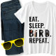 Vogelbeobachter, Vogelbeobachter, Ornithologen und Naturliebhaber werden diesen T - Shirt mit dem Sprichwort "Eat.", der ihren Lieblingsaufenthalt feiert, in Liebe nehmen. Schlafen. Vogel. Wiederholen." Ob es sich dabei um einen Hobbyisten handelt, der die Vögel in ihren Hinterhöfen genießt, oder um einen seriösen Fotografen, der das interessante Leben dieser wunderschönen Singvögel dokumentiert, sie werden die niedlichen Vögel, die aus den Briefen auf der Vorderseite herausgucken, Liebe geben. Ein hellroter Kardinal, eine weiche Taube, ein bezaubernder, heruntergekommener Specker und eine auffallend blaue Jay machen ihr Aussehen auf diesem Shirt, wie sie oft gerne unsere Höfe besuchen! Auf der Rückseite wird das Sprichwort wiederholt, und Sie können wählen, um es behalten oder den Text mit dem Namen Ihres Lieblings-Vogelbeobachters, einem Vogelklub, dem Sie gehören, oder einem anderen lustigen Vogelbeobachtung-Sprichwort, das Sie Liebe. Auch auf der Rückseite finden Sie ein volles Foto einer Taube! Ich liebe Vögel schon seit Jahren, und ich fotografiere gerne die Besucher meiner Garten-Gefechte und andere, die ich in den Parks der Umgebung treffe. Ich hoffe, Sie werden dieses Design genießen! Fotos und Design von Amanda Renee, CtrlZ Digital Designs