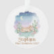 This enchanting ornament features a serene sleeping pony nestled among blooming cacti and succulents under a gentle crescent moon. The soft pastel watercolor palette creates a peaceful desert night scene perfect for celebrating a new addition to the family. It serves as a timeless keepsake that brings a touch of whimsical boho charm to any holiday tree.