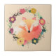 Ein schlafender Fuchs wird in einem hübschen boho-artigen Blumenkranz im Aquarellbild auf dieser Kachel aufgerollt. Die Farbtöne im Bild sind rot-orange, goldfarben, creme, lila violett, rosa, braun und grün. Das Bild wird auf einem hellen oder beigen Hintergrund platziert.
