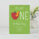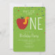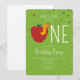 Laden Sie Ihre Lieben zum ersten Geburtstag Ihres Kindes ein, mit diesen Party Einladungen, die von einem Apfel umgeben sind, der von Konfetti umgeben ist und von einem grünen Hintergrund ausgeht. Personalisieren Sie Ihre Party-Daten!