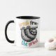 Eine Kaffee-Tasse mit dem Begriff "Break from the Grind" in fett gedruckten Buchstaben, begleitet von einer Grafik eines entspannten Schlamms, symbolisiert einen langsamen, sorglosen Lebensstil und die Wichtigkeit, Zeit für sich selbst zu nehmen.