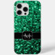 Emerald Green Imitate Glitzer Glitzern Monogram iPhone 15 Fall. Personalisieren Sie Funkelnd iPhone Gehäuse mit Ihrem Initial und Namen. Schöne mädchenhafte glamouröse glänzende Glitzer Glitzern. Foto von Glitzern nicht wirklich Glitzer!