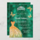Eine moderne, stilvolle und glamouröse Einladung zu einer Quinceañera, 15. Geburtstagsfeier. Ein gestuftes smaragdgrünes Hintergrund mit einem Imitat Gold ein Kleid, ein Imitat silberne Tiara und goldene Schmetterlinge. Der Name ist mit einem modernen handgeschriebenen Stilskript geschrieben. Personalisieren Sie Ihre Party-Daten und fügen Sie sie hinzu.