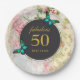 Eine Geburtstagszeitung - fabelhaft 50 mit personalisiertem Namen. Entworfen mit eleganten grünen Schmetterlingen. Ein schwarzer, kreisförmiger Rahmen in der Mitte überlagert ein Vintages Collage-Muster mit farbigen rosa Rosen und grünen goldenen Blätter mit einem schillernden, altmodischen Look.