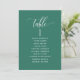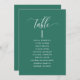 Helfen Sie Ihren Gästen mit diesen eleganten, modernen Sitzplakaten mit Gästebamen ihren Tisch zu finden. Doppelseitige Karten, damit die Gäste von beiden Seiten, vorn oder hinten nach ihren Namen suchen können. Klare Platzverhältnisse, die Ihnen die Möglichkeit geben, Clips oder Lochausschnitte für hängende Displays zu verwenden oder Tischhalter/Rahmen zu verwenden. Grün und weißer Text. Moderne handgeschriebene Kalligrafiedetails. Mehrere Farboptionen. Haben Sie alle Tischnummern in der gleichen Farbe oder mischen Sie die Farben nach dem Farbthema Ihres Events.