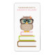 Adorable Abbildung einer niedlichen Eule mit einer übergroßen Lesebrille, die auf einem Buchstapel sitzt.