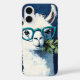 Playful twist to cute animal art and humor with a quirky white llama rocking teal glasses and holding a leafy branch.