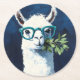 Playful twist to cute animal art and humor with a quirky white llama rocking teal glasses and holding a leafy branch.