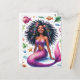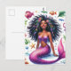 This vibrant fantasy postcard features watercolor artwork of a 'Black' mermaid surrounded by sea life. The dark brown-skinned mer creature poses on the sea floor with a beautiful smile, wearing a purple top. She has a scaly pink tail and is surrounded by fish, starfish, bubbles, and other ocean creatures and botanical elements. The beautiful mermaid has thick, long, naturally curly hair fanning out from her radiant, melanin-rich face in the underwater scene.
