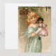 Charming young smiling Victorian girl in pale teal gown holding her doll at a fancy Christmas Ball with tree and party-goers in background.
