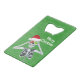 Cet ouvre-bouteille de carte de crédit qui s'intègre dans votre porte-monnaie a un squelette souriant portant un casquette du Père Noël rouge tenant des ornements brillants à ses yeux sur un arrière - plan vert avec de minuscules éclats d'or. Customisez le texte Joyeux Noël avec le modèle.