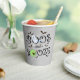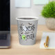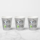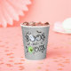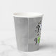 Zu den Paperbechern von Boos & Booze gehören ein rauchiger grundiger Hintergrund mit schwarzem Trimm auf der Seite, fliegende Fledermäuse, ein strahlend blauer Geist, der durch "Boos" fliegt, eine Tasse schwindelnden grünen Stiefel mit rotem Augapfel und Stroh.