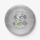 Die Teller von Boos & Booze Halloween sind mit grauem grauem Hintergrund, Fledermäusen, einem strahlend blauen Geist, der durch "Boos" fliegt, einem Tasse schwindelnden grünen Schnaps mit rotem Augapfel und Stroh ausgestattet.