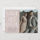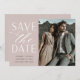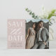 A modern save the date card designed to accommodate your favorite vertical engagement photo. "Save the date" appears alongside your photo in white block and script lettering, with your names, wedding date and wedding location beneath. Cards reverse to reveal additional save the date details.