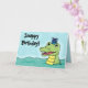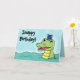 Une carte d'anniversaire lumineuse et mignonne avec un crocodile de dessin animé vert souriant nageant dans une eau trouble tout en équilibrant un cadeau d'anniversaire bleu et violet sur sa tête. Sur le devant on peut lire "Anniversaire Snappy !" et à l'intérieur "Passez une journée fantastique !" mais vous pouvez les customiser à tout ce que vous voulez !