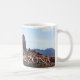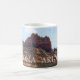 Weiß und Jäger grün 11 oz. Combo-Tasse mit einem Aquarellbild einer vorherrschenden und erkennbaren roten Felsformation, nah zur Stadt Sedona am Fuße der Crimson Cliffs.