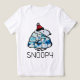 This classic short-sleeve T-shirt features the beloved Snoopy character prominently displayed in the center. The graphic shows Snoopy dressed warmly for cold weather in a puffy winter coat patterned with a striking blue and white geometric/mosaic design, and topped with a red and white knit cap. Set against a white background, this shirt is a fun and comfortable apparel item, perfect for everyday wear, or as a stylish seasonal layer during the winter months.