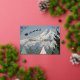 Seasonal holiday card that features a scenic, landscape photo image of snow covered Mount Hood with colorful Christmas tree symbols and a Santa Claus sleigh with reindeer silhouette, along with Season's Greetings in silver foil printing.