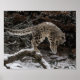 Schneeleopardenwabe springt von einem Baum, um in den Schnee zu springen.
