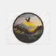 A sticker with an eagle flying over a mountain, in the style of contemporary landscape, golden light, black mountain college, fisheye lens, arts and crafts movement, mid-century illustration