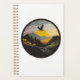 A sticker with an eagle flying over a mountain, in the style of contemporary landscape, golden light, black mountain college, fisheye lens, arts and crafts movement, mid-century illustration