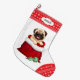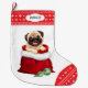 Ein bezaubernder kleiner Mops Pop aus einer roten Geschenktasche vor diesem Weihnachtsfest Strumpf. Ein paar aquamarine und goldene Holiday Baum Glühbirnen liegen direkt vor der Santa-Tasche Das Bild wird auf einem weißen Hintergrund platziert, und die Zehen und obere Grenze sind ein rot-weißes Schneeflockenmuster. An der oberen Grenze befindet sich ein weißes Etikett mit dem eigenen Text in dunkelgrau. Die Rückseite des Strumpfs weist das gleiche rote und weiße Schneeflockenmuster auf.
