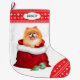 Ein bezaubernder kleiner Spitz Pop aus einer roten Geschenktasche vor diesem Weihnachtsfest Strumpf. Ein paar aquamarine und goldene Holiday Baum Glühbirnen liegen direkt vor der Santa-Tasche Das Bild wird auf einem weißen Hintergrund platziert, und die Zehen und obere Grenze sind ein rot-weißes Schneeflockenmuster. An der oberen Grenze befindet sich ein weißes Etikett mit dem eigenen Text in dunkelgrau. Die Rückseite des Strumpfs weist das gleiche rote und weiße Schneeflockenmuster auf.