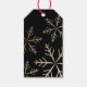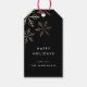 Moderne, elegante Weihnachtsgeschenke mit fallenden Goldschneeflocken auf einem schwarzen Etikett.