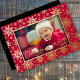 Elegante Schneeflocke Foto Frame Foil Holiday Card. Eine Wirble Schrift Typografie Rechtschreibung First Christmas und Ihr individualisierbarer Name und Jahr auch in realer Folie. Fügen Sie Ihr Foto hinzu, das Shadow Foto Overlay im goldenen Rahmen verleiht dem Foto einen 3D-Effekt und bildet ein modernes, klassisches und traditionelles Winterwunderland mit einer abfallenden Schneeflocke auf rotem Hintergrund. Die Folienoptionen sind Gold, Silber und Rose Gold. Passen Sie den Text an, der rückseitige Text ist optional, oder löschen Sie ihn. Ein Sake für neue Eltern, Familie und Freunde.