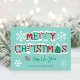 Festliche Winterschneeflocken und typografische Weihnachtskarte mit schneebedeckten "Frohe Weihnachten"-Wünschen in Rot, Grün und Weiß mit Süßspeisen und einem Weihnachtsbaum, der die Buchstaben "R" und "A" ersetzt, und einem "Happy New Year"-Gruß auf einem Minzhintergrund. Original-Kunstwerk KL Stock.