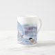 Im Inneren einer Schneekugel liegt eine Winterlandschaft mit einer Hütte, die von nackten Ahorn- und Kirschbäumen überschattet wird. Schneeflocken auf dem Rasen, heilige Sträucher mit leuchtend roten Beeren flankieren die Tür und Schneeflocken stürzen durch die gefrorene Luft. Neben dem Globus sieht ein kleines Jägerchen in der Miniaturszene merkwürdig aus.