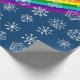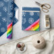 Enveloppement cadeau très cool dans un bleu nuit profond couvert de flocons blancs et avec une série de couleurs arc-en-ciel.